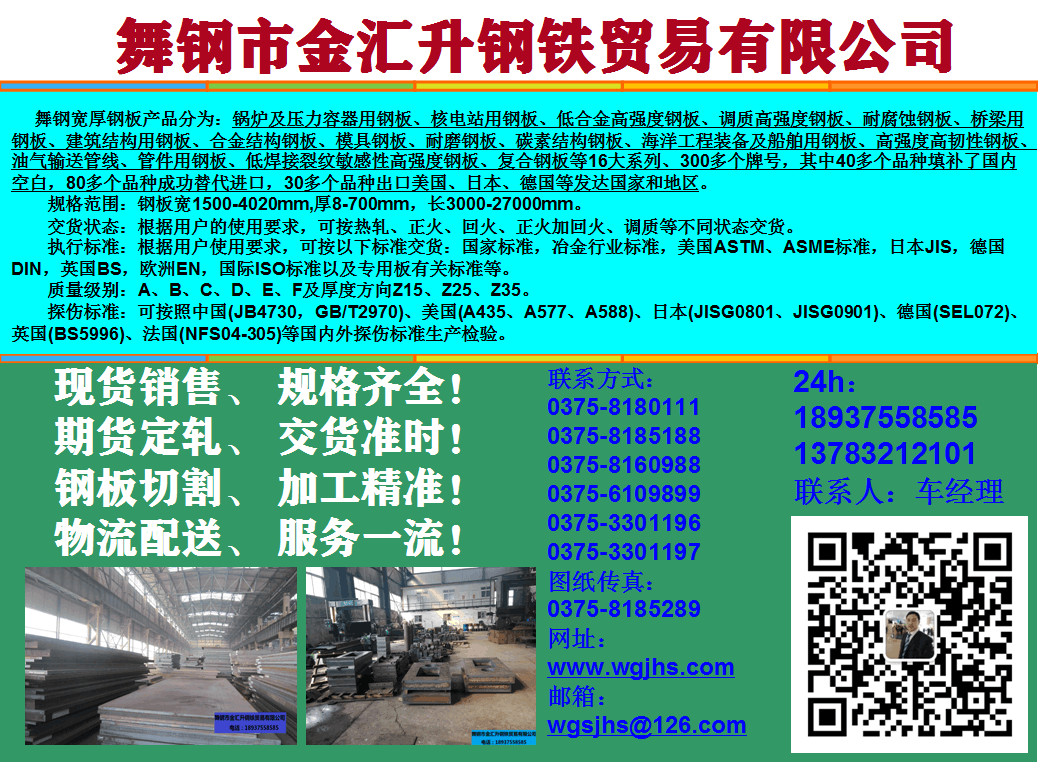 主营材质:中厚板、高强度低合金、耐磨钢板、锅炉及压力容器用钢板、船板、模具钢板、桥梁钢板、高层建筑用钢板、管线钢板、核电钢板、调质型耐磨钢板、调质型高强度低合金钢板、海洋采油平台用钢板、风电塔用钢板、军工钢板、耐腐蚀钢板、HIC钢板、临氢钢板、铬钼钢板等特种钢业务!